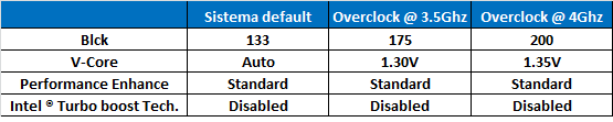 I test effettuati sono stati svolti con le impostazioni del Bios inserite nella tabella sottostante; gli altri parametri sono stati lasciati tutti su Auto. Abbiamo utilizzato l’utility “Prime95” per stressare la CPU e “Real Temp” per misurare le temperature.
