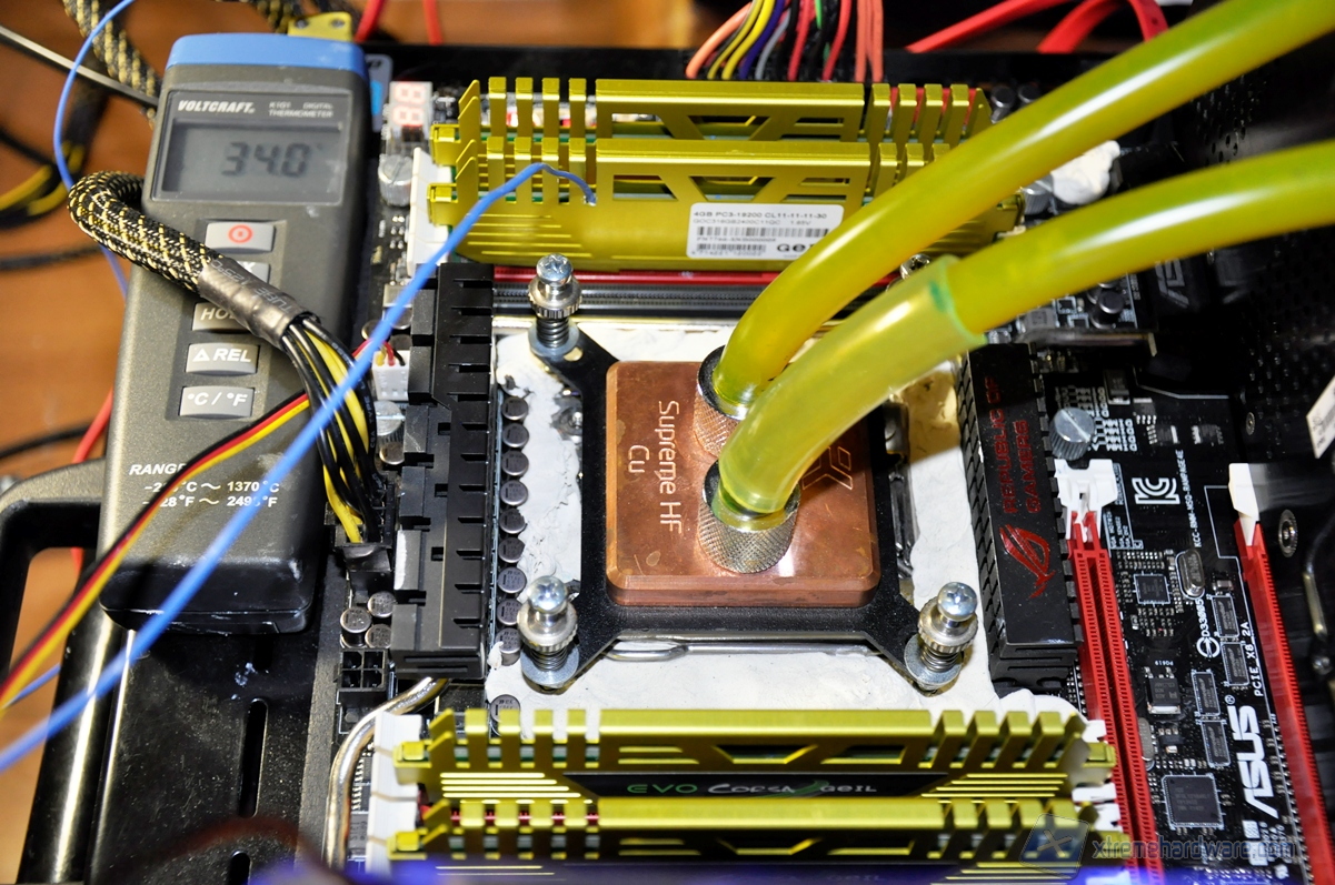 Su RAMPAGE V EXTREME con una temperatura ambiente di 32,3° ed un undervolt di 0,4v, abbiamo misurato con termometro digitale della VOLTCRAFT K101 una temperatura di lavoro di 34°.